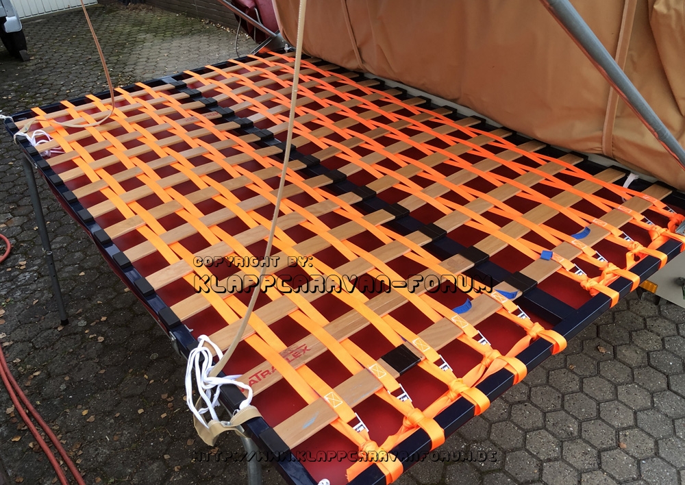 Die Federholzleisten zeigten sich als zu schwächlich. Statt diese neu zu kaufen, wurden sie einem ausgemusterten Federholzrahmen entnommen und dann ordentlich mit Spanngurten "verstärkt".
