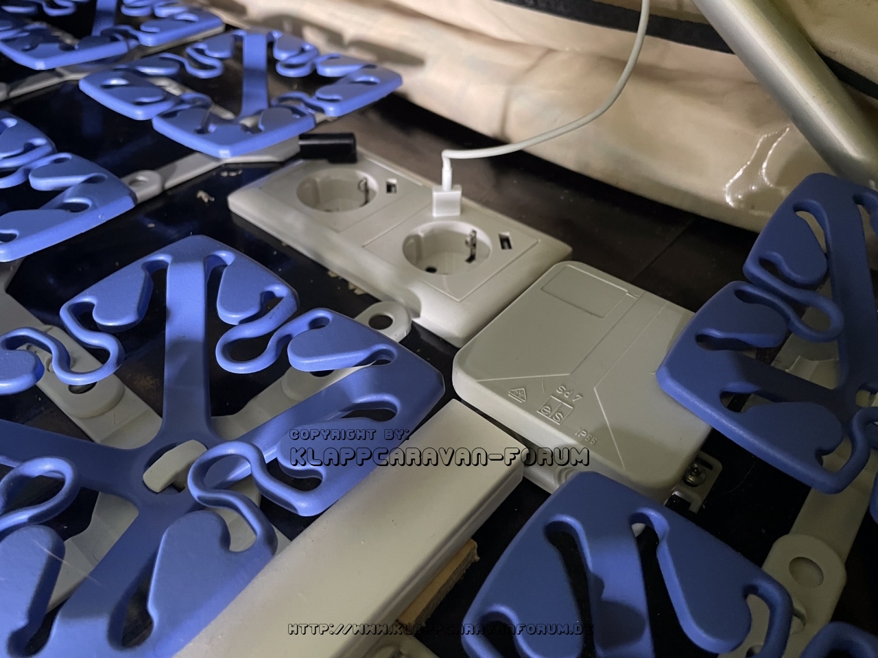 Von außen wird der Strom zentral über die CE-Buchse unterhalb der Zeltplattform eingespeist. Mit Kabelkanälen wird der Strom unterhalb der Matratze zu Doppelsteckdosen am Kopf- und Fußende verteilt sowie im Laderaum zur Versorgung der Campingküche.