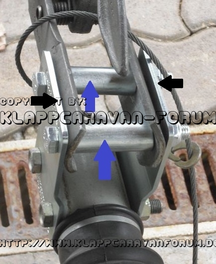 Wenn ich die Antischlinerkupplung montieren würde, wird sie zwischen die beiden Bleche der Deichselerhöhung geschraubt (Pfeile Schwarz). An die Stelle wo jetzt die Kupplung (KK82) geschraubt ist. Also brauch ich weder bohren oder schweißen. Die Befestigungslöcher und der Lochabstand passen überein. Als zusätzliche Stabilisierung der Kupplung werden noch Distanzhülsen (Pfeile Blau) über die Schrauben gesteckt. Dies ist auch schon für die jetzige vorgeschrieben. Aber ich muss mal abwarten was dazu der Prüfer sagt, mit der ASK, weil die Betriebserlaubniss der Erhöhung nur für die KK82 und KK92 besteht. Nicht dass mit der ASK die BE erlicht. Wenn der Prüfer Nein sagt, dann wird diese nicht angeschraubt. War ja nur ein Gedanke, weil die ASK nur rumliegt und ich hätte diese wegen der zusätzlichen Sicherheit anbauen können. Wie heist´s so schön; "Sicherheit geht über Alles!!".