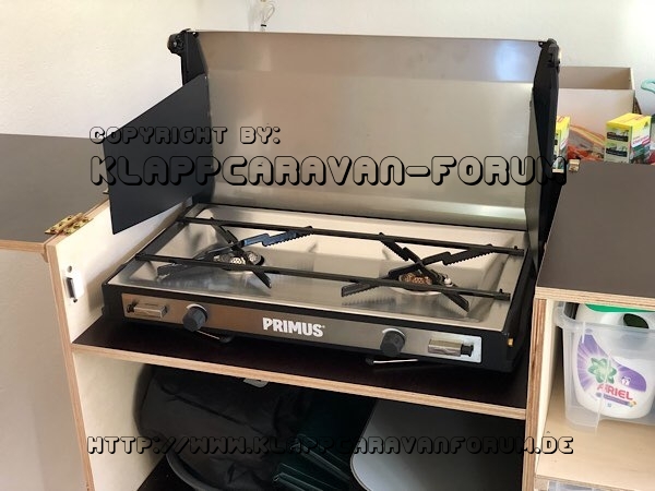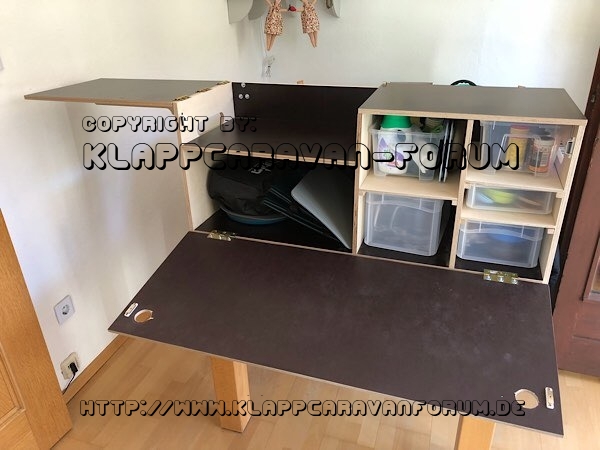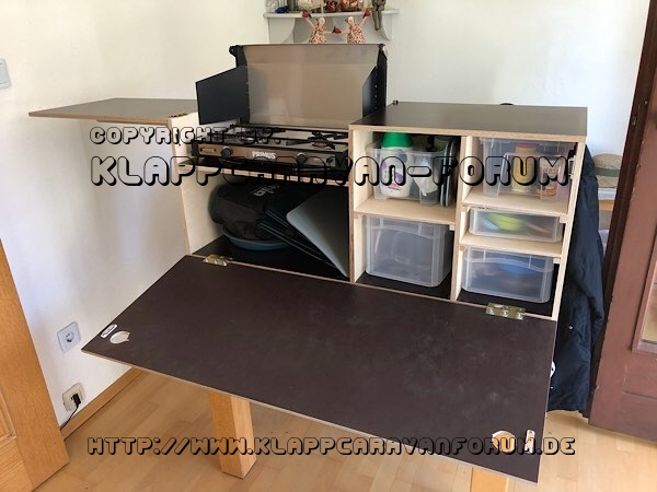 In den aufgeklappten Bereich kommt der Kocher. Die Fächer rechts werden noch mit Böden unterteilt. Das kommt heute Nachmittag dran.